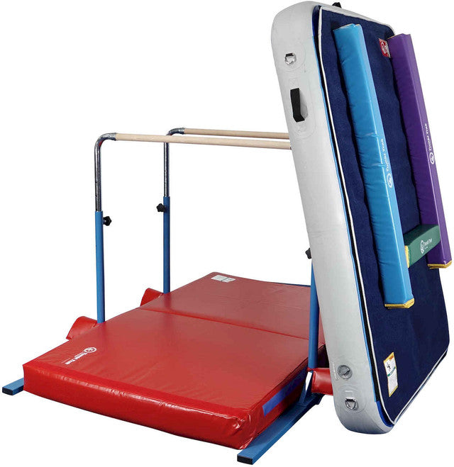 Tumbl Trak's™ 5-in-1 Bar System is a high-end, gymnastics training bar system for both male and female gymnasts. It is high quality, sturdy and fully adjustable in both height and width.
