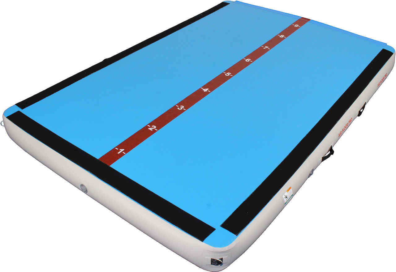 The Air Floor PRO is made with a higher quality, eco-friendly material that is lighter weight, more durable and does not have harsh or damaging chemicals. The Air Floor PRO comes in three sizes, 3, 6 and 9-meters, and features a numbered centered line for use as a visual aid for tumbling.