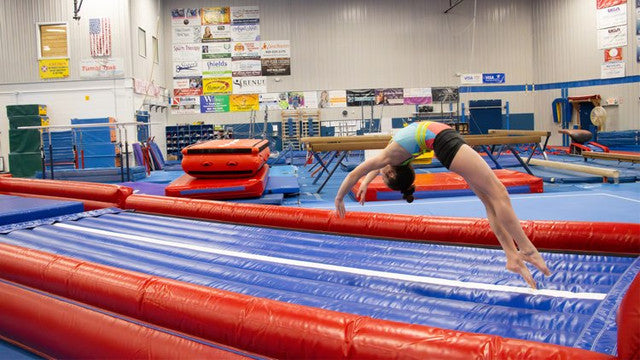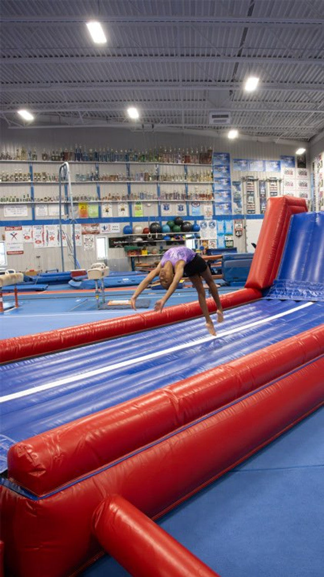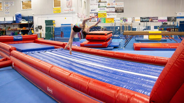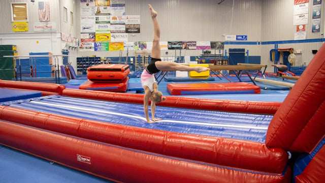 The Air Trak is an air-filled Tumbl Trak offering portability and easy storage for cheer and gymnastics clubs. At 9 ft wide, it's the widest tumbling track out there which is great for beginner tumblers who haven't yet learned how to tumble straight.