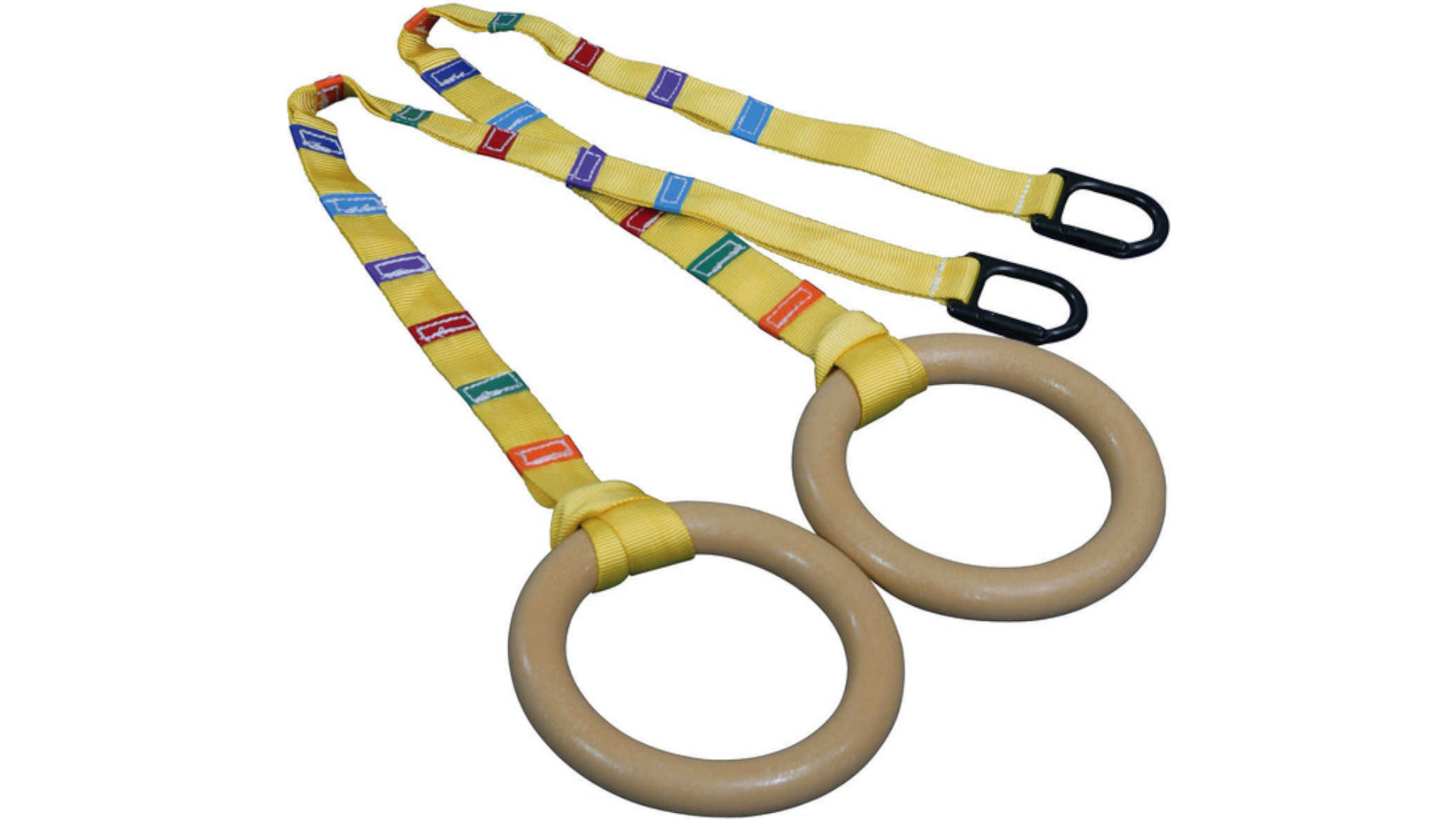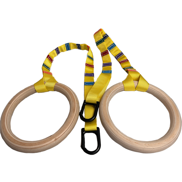 Useful for gymnastics programs, obstacle courses, fitness programs, and preschool play. Each set of Gymnastic Rings straps that fully adjustable in height. Don't want the rings and are just interested in our adjustable straps? Consider the 9-foot straps only option, which are made similarly to the ones that come with the rings, but allow for suspension from higher heights (like competitive rings or high bar) and are reachable for ground work. These rings are not intended for gymnastics rings competition. However, using gymnastic rings like these can help with: grip strength from hanging, swinging, pull-ups, leg lifts, arm strength and ab strength.