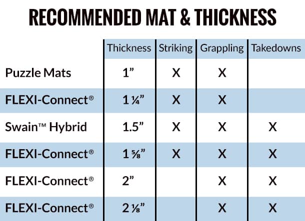 THICKNESS: Knowing the best option for your martial arts style is the first step in choosing the right Dollamur mat. We have developed a general guideline to assist you in selecting the best flooring for your dojo.